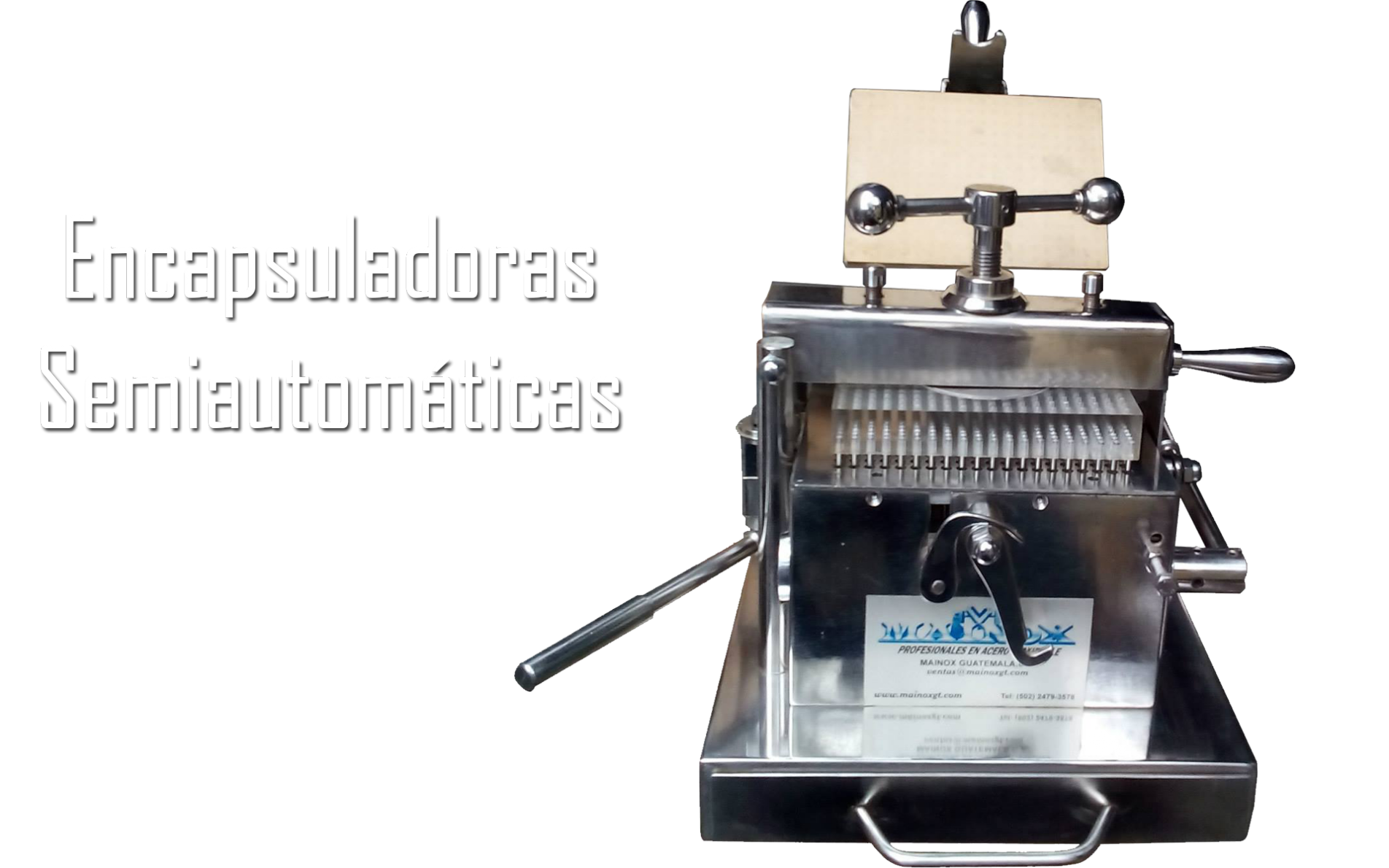Somos una empresa 100% guatemalteca, orgullosamente, fabricantes de máquinas encapsuladoras semiautomáticas las cuales llenan capsulas con gran rapidez. Acomodan, destapan y tapan 300 cápsulas por ciclo para un aproximado de 3,600 cápsulas por hora, para mayor información estamos atentos para servirles como ustedes se merecen recibiéndolos gustosamente en nuestras instalaciones.