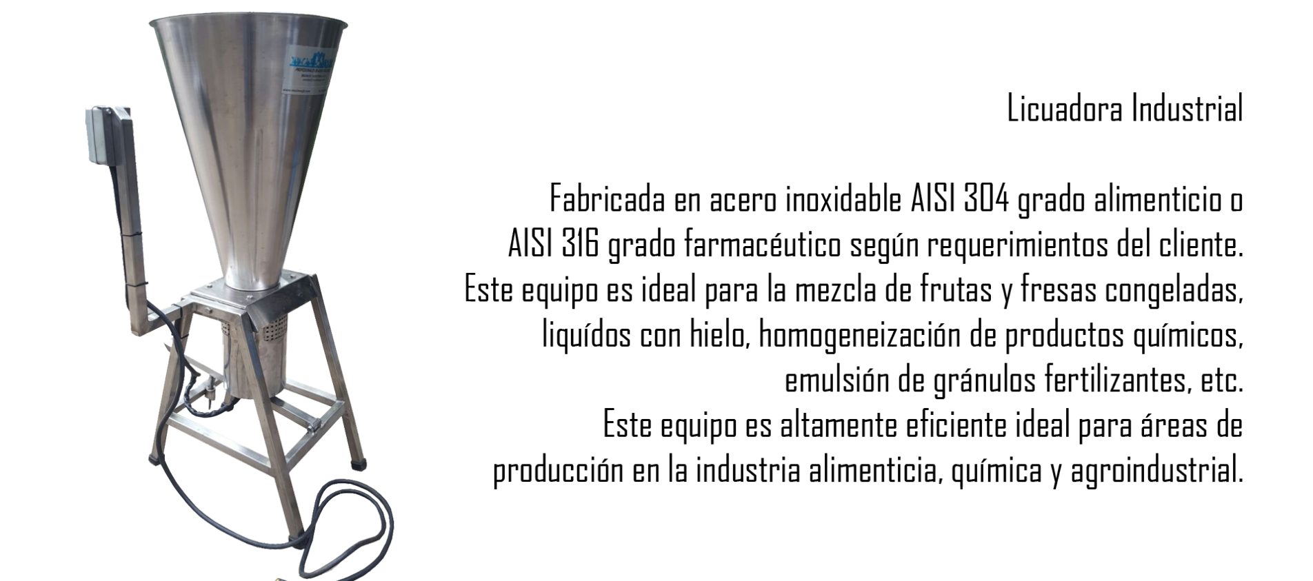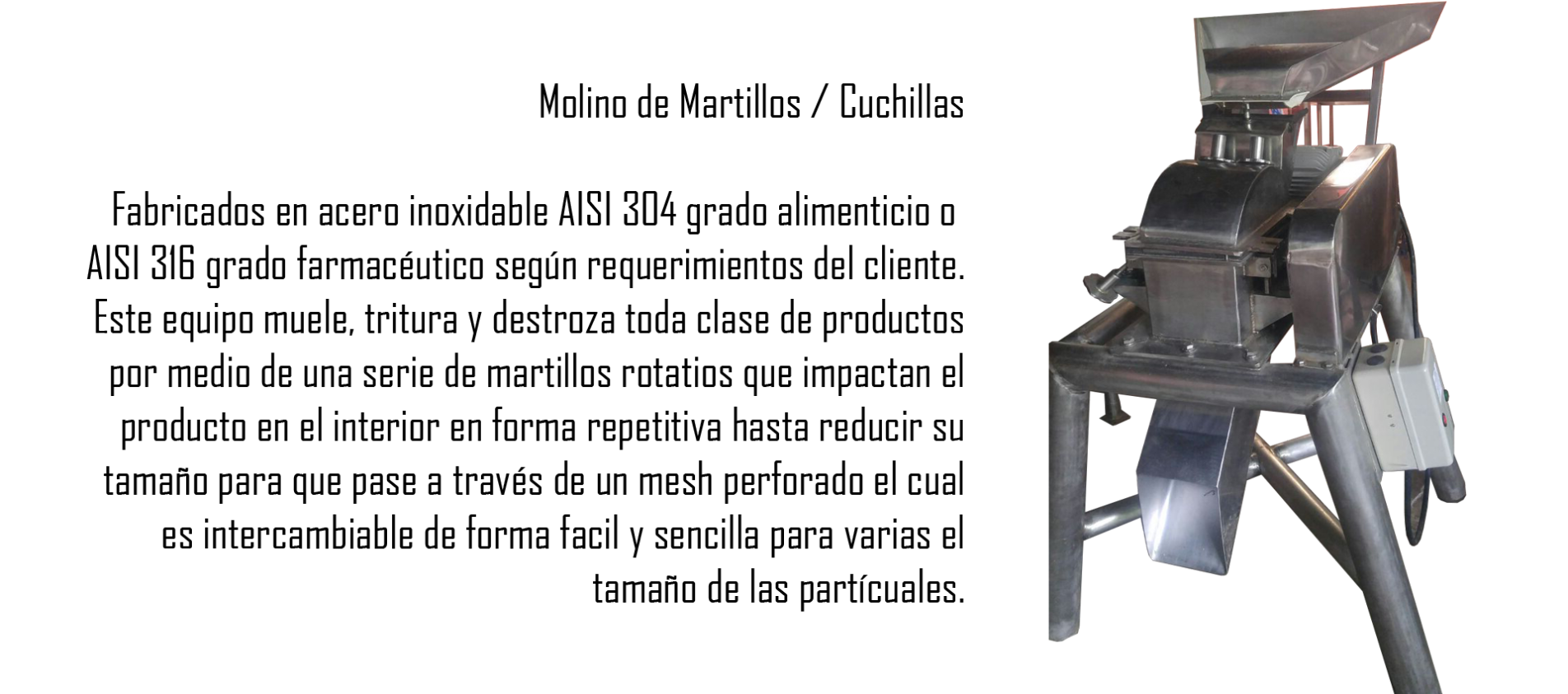 Molinos coloídales, pulverizadores de cuchillas, de martillos y licuadoras industriales, equipos de alta resistencia y gran durabilidad, equipos fabricados en acerp inoxidable AISI 304 grado alimenticio y AISI 316 grado farmaceútico según requerimientos del cliente.